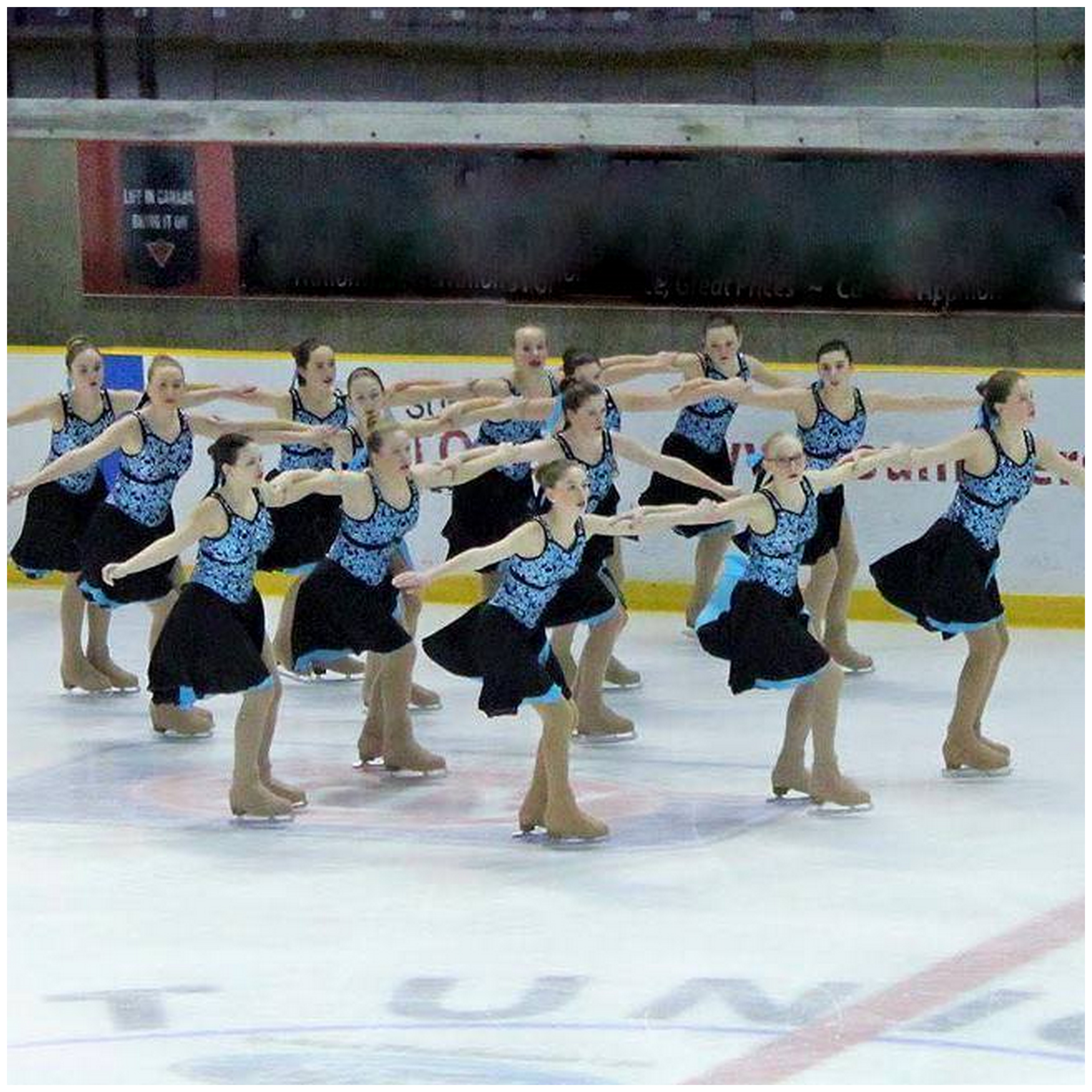 Synchronized skating is a specialized discipline of skating involving groups of eight or more skaters performing various group formations and maneuvers. The objective is for the team to perform as one unit executing circles, blocks, lines, wheels and intersections in unison to the music, while demonstrating quality edges, power and flow.